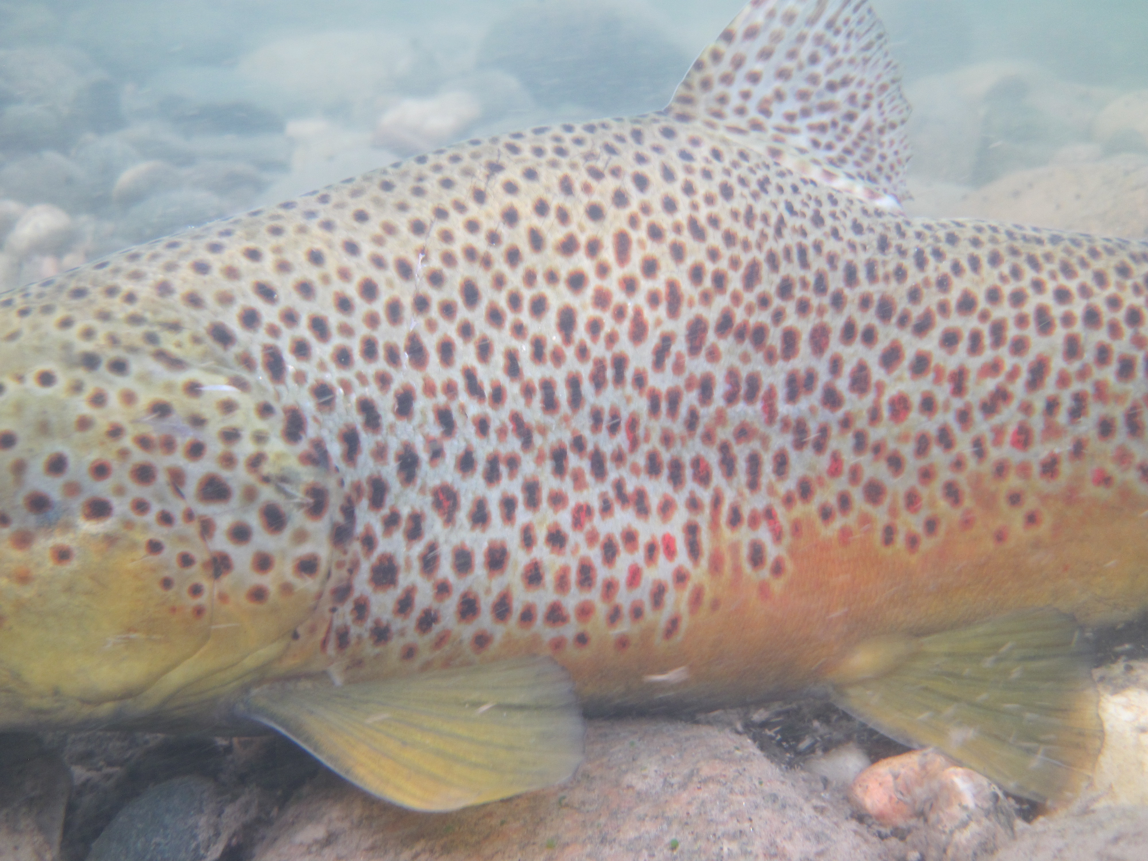 Here is an incredibly colored fall spawning brown trout (picture shot underwater). This particular fish is a male, 21″ long.